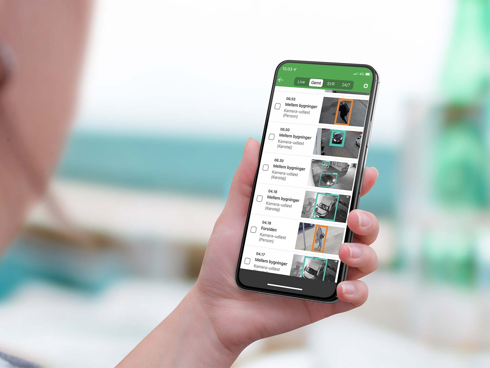 Via din App kan du på blot få sekunder, få en komplet liste over alle dine video hændelser fra de sidste 30 dage. Ved hjælp af den smarte AI søgning af personer, biler eller dyr, aktiveret alarmer og til/frakoblinger m.m. kan man frit vælge hvilke former for video hændelser man ønsker og se.